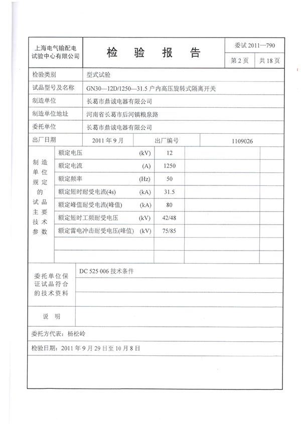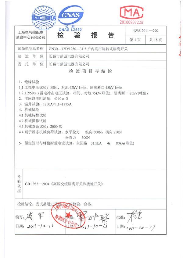 GN30隔離開關(guān)檢驗報告長葛市鼎誠電器有限公司